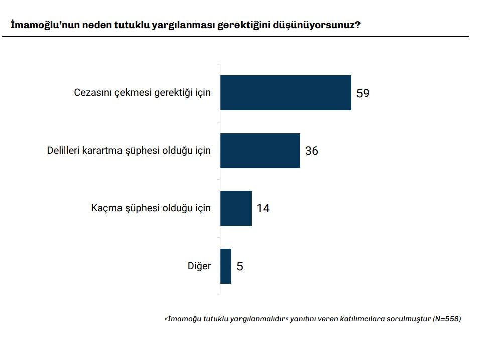 İmamoğlu’nun tutuklu yargılanması gerekenlere bir de neden bu şekilde düşündüğü soruldu. Bu soruya sadece ‘İmamoğlu tutuklu yargılanmalı’ diyen yüzde 27’lik kesim cevap verdi. Katılımcıların yüzde 59’ı İmamoğlu’nun cezasını çekmesi için, yüzde 36’sı delil karartma şüphesi olduğu için, yüzde 14’ü kaçma şüphesi olduğu için İmamoğlu’nun tutuklu yargılanması gerektiği düşüncesinde.