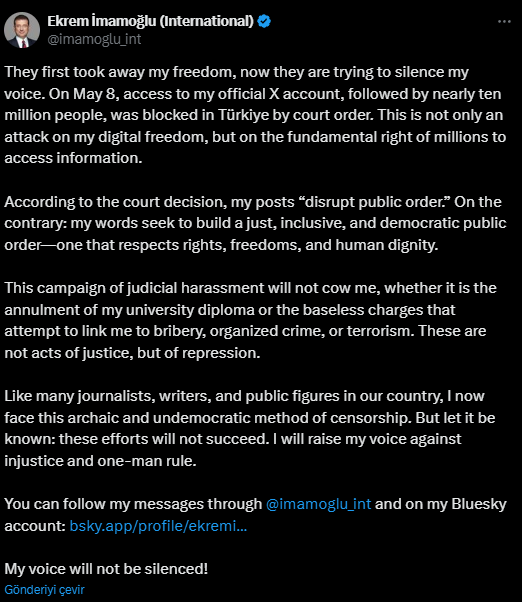 İmamoğlu, X hesabının engellenmesinin ardından hesabının İngilizce versiyonundan sert bir açıklama yaptı. Önce özgürlüğünün elinden alındığını aktaran İmamoğlu, antidemokratik bir sansür ile karşı karşıya olduğunu ancak sesinin tek adamlığa karşı susturulamayacağını ifade etti: