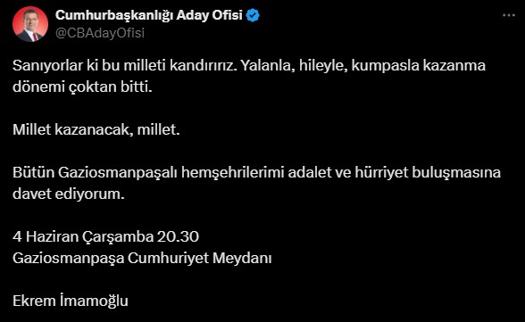 Ekrem İmamoğlu Cumhurbaşkanlığı Aday Ofisi resmi hesabından yapılan paylaşımda, “Sanıyorlar ki bu milleti kandırırız. Yalanla, hileyle, kumpasla kazanma dönemi çoktan bitti. Millet kazanacak, millet. Bütün Gaziosmanpaşalı hemşehrilerimi adalet ve hürriyet buluşmasına davet ediyorum” ifadeleri kullanıldı.