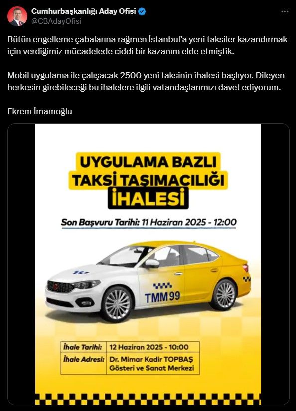 Mobil uygulama ile çalışacak 2500 yeni taksinin ihalesi başlıyor. Dileyen herkesin girebileceği bu ihalelere ilgili vatandaşlarımızı davet ediyorum.”