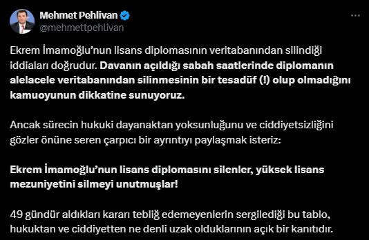 Ekrem İmamoğlu’nun lisans diplomasının veritabanından silindiği iddiaları doğrudur. Davanın açıldığı sabah saatlerinde diplomanın alelacele veritabanından silinmesinin bir tesadüf (!) olup olmadığını kamuoyunun dikkatine sunuyoruz. Ancak sürecin hukuki dayanaktan yoksunluğunu ve ciddiyetsizliğini gözler önüne seren çarpıcı bir ayrıntıyı paylaşmak isteriz: Ekrem İmamoğlu’nun lisans diplomasını silenler, yüksek lisans mezuniyetini silmeyi unutmuşlar! 49 gündür aldıkları kararı tebliğ edemeyenlerin sergilediği bu tablo, hukuktan ve ciddiyetten ne denli uzak olduklarının açık bir kanıtıdır.