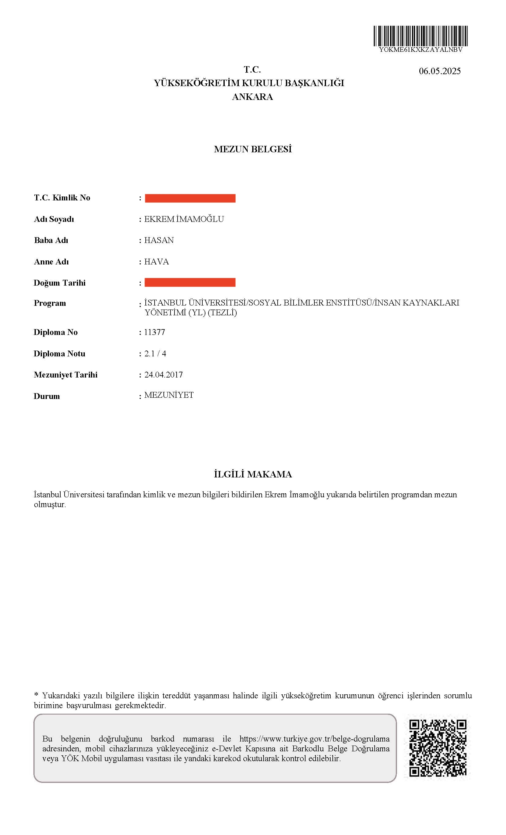 İmamoğlu’nun avukatı Mehmet Pehlivan, diplomanın veri tabanından silindiğini ancak aynı üniversitenin İmamoğlu’nun yüksek lisans mezuniyetini silmeyi unuttuklarını ifade etti: