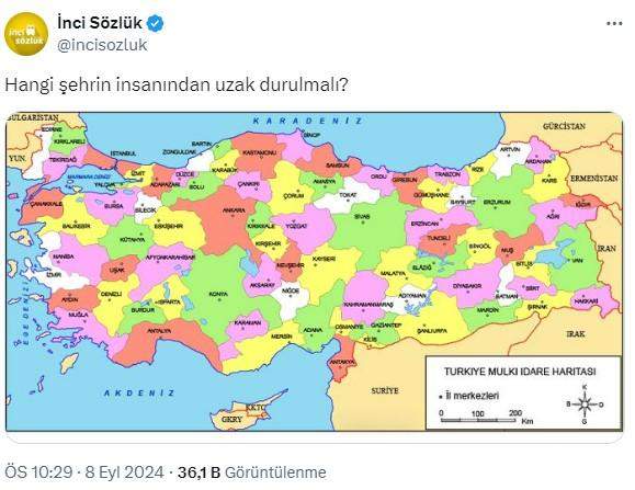 İnci Sözlük, Twitter’dan Türkiye haritası paylaşıp, “Hangi şehrin insanından uzak durulmalı?” diye sordu. Paylaşıma vatandaşlar, “Her şehrin iyi insanı da var kötüsü de. İnsanları birbirine düşürmeye çalışıyorsunuz.” diye tepki gösterdi.