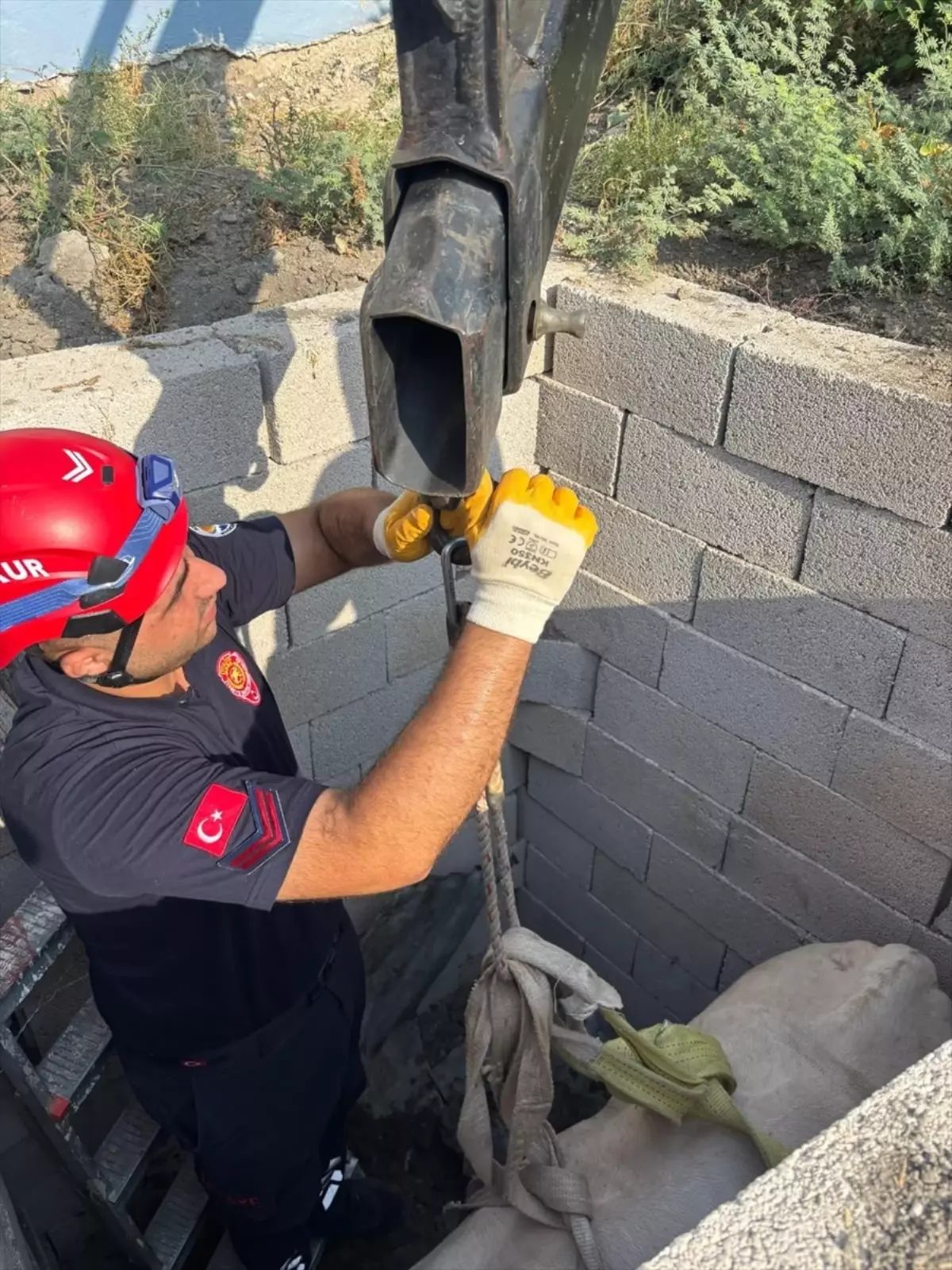 İhbar üzerine olay yerine sevk edilen itfaiye ekipleri, halatla bağladıkları ineği iş makinesi yardımıyla kuyudan çıkardı.