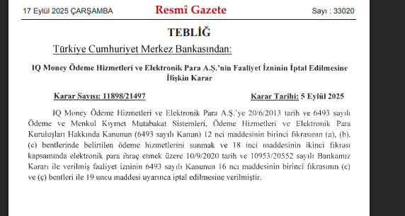 Resmi Gazete’de yer alan karar metni şu şekilde; “IQ Money Ödeme Hizmetleri ve Elektronik Para A.Ş.’ye 20/6/2013 tarih ve 6493 sayılı Ödeme ve Menkul Kıymet Mutabakat Sistemleri, Ödeme Hizmetleri ve Elektronik Para Kuruluşları Hakkında Kanunun (6493 sayılı Kanun) 12 nci maddesinin birinci fıkrasının (a), (b), (c) bentlerinde belirtilen ödeme hizmetlerini sunmak ve 18 inci maddesinin ikinci fıkrası kapsamında elektronik para ihraç etmek üzere 10/9/2020 tarih ve 10953/20552 sayılı Bankamız Kararı ile verilmiş faaliyet izninin 6493 sayılı Kanunun 16 ncı maddesinin birinci fıkrasının (c) ve (ç) bentleri ile 19 uncu maddesi uyarınca iptal edilmesine verilmiştir.