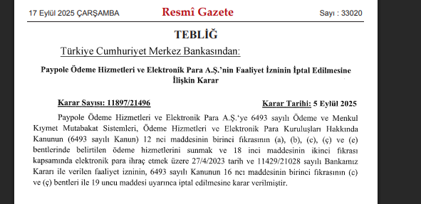 Paypole Ödeme Hizmetleri ve Elektronik Para A.Ş.’ye 6493 sayılı Ödeme ve Menkul Kıymet Mutabakat Sistemleri, Ödeme Hizmetleri ve Elektronik Para Kuruluşları Hakkında Kanunun (6493 sayılı Kanun) 12 nci maddesinin birinci fıkrasının (a), (b), (c), (ç) ve (e) bentlerinde belirtilen ödeme hizmetlerini sunmak ve 18 inci maddesinin ikinci fıkrası kapsamında elektronik para ihraç etmek üzere 27/4/2023 tarih ve 11429/21028 sayılı Bankamız Kararı ile verilen faaliyet izninin, 6493 sayılı Kanunun 16 ncı maddesinin birinci fıkrasının (c) ve (ç) bentleri ile 19 uncu maddesi uyarınca iptal edilmesine karar verilmiştir.”