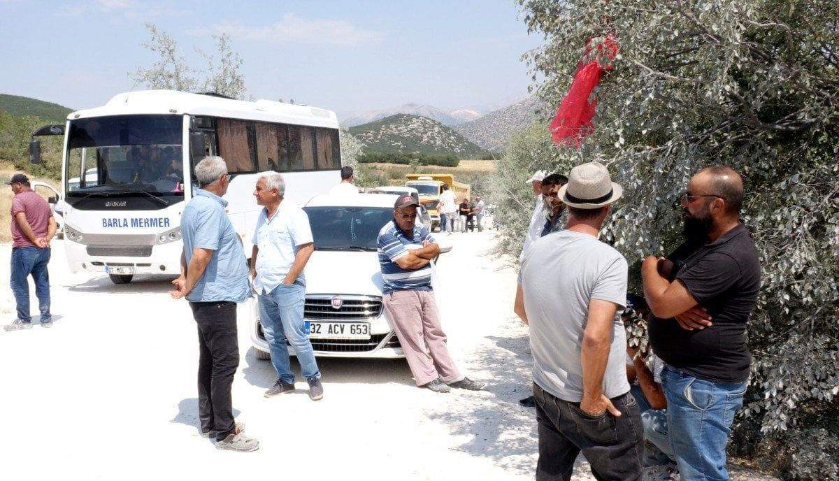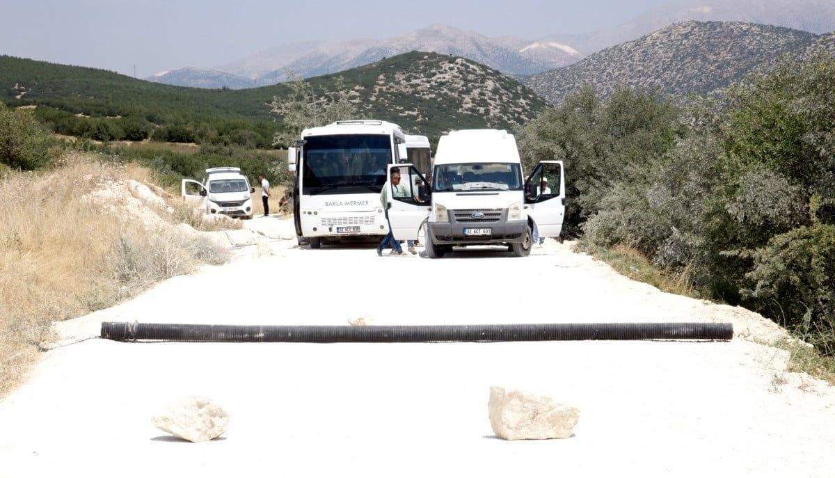 Arazisinden bölgedeki mermer ocağına giden yolu kullanan araçların oluşturduğu toz nedeniyle güllerinin zarar gördüğünü iddia eden Özcan Uslu, ailesiyle yolu kesti.