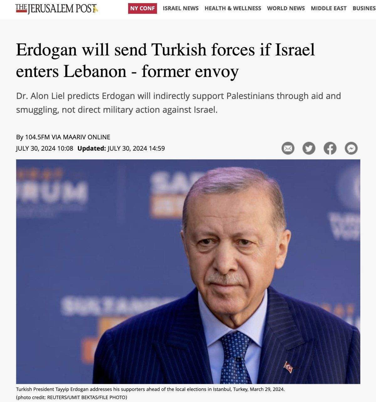 Bir radyoya savaş gündemini değerlendiren Liel’in sözlerini haberleştiren The Jerusalem Post’a göre Liel, Erdoğan’ın ciddiye alınması gerektiğini belirtti.