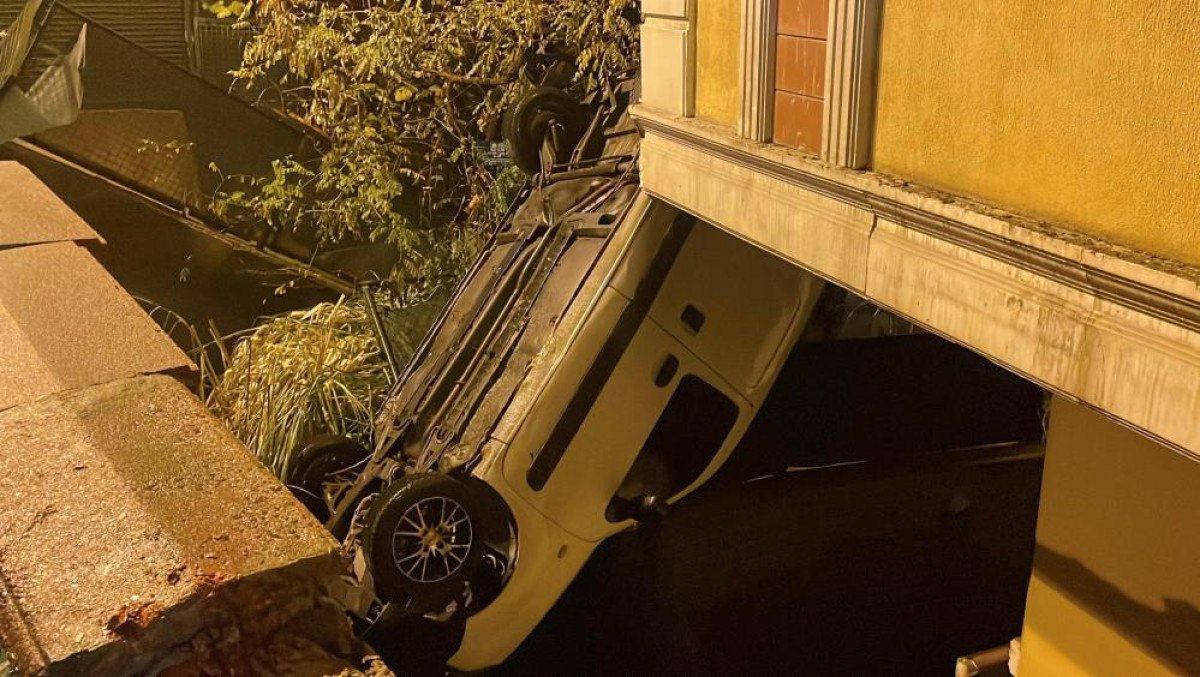 Binanın bazı duvarlarında kısmi hasar oluştuğunu söyleyen bina sakini Banu Korcan ise “Şu an bir alt kattaki ebeveyn banyomun taşını zedelemiş durumda. Eğer bu araç düşerse alt katı ve bir altını ciddi şekilde tahrip edebilir. Aracı tutan bahçe demirleri ise o kadar ince ki şu an sadece ufak bir parça aracı tutuyor” ifadelerini kullandı.