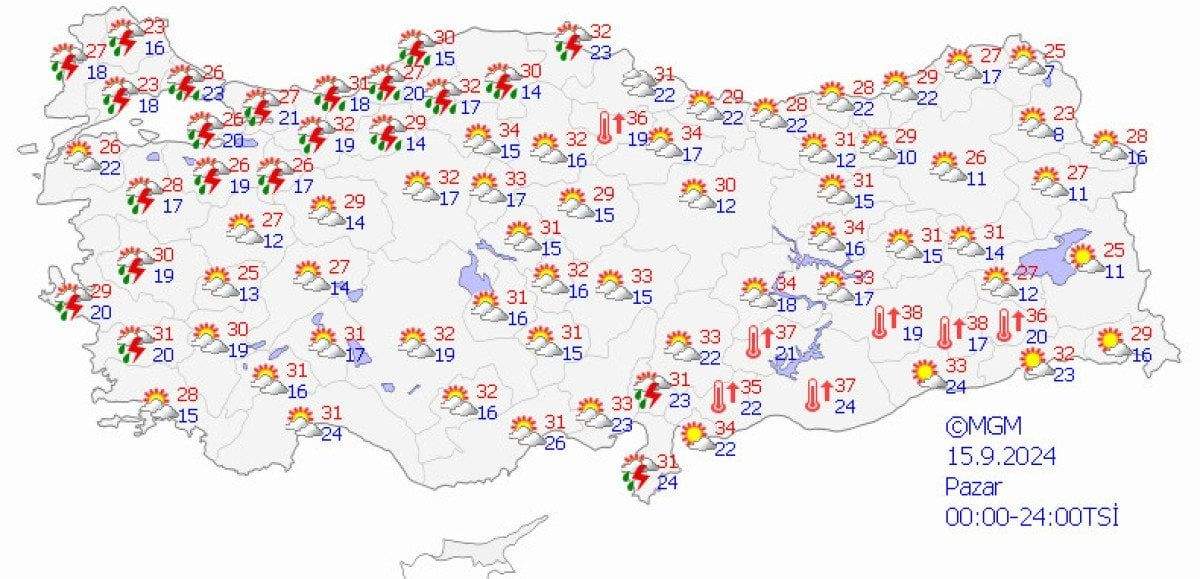 Yapılan son değerlendirmeler göre yağışların yarın öğle saatlerinde (15/09/2024) Batı Karadeniz kıyıları ve İstanbul çevrelerinde yerel kuvvetli olması beklendiğinden ani sel, su baskını, yıldırım, yerel dolu yağışı ve yağış anında kuvvetli rüzgar gibi olumsuzluklara karşı dikkatli ve tedbirli olunması gerekmektedir.