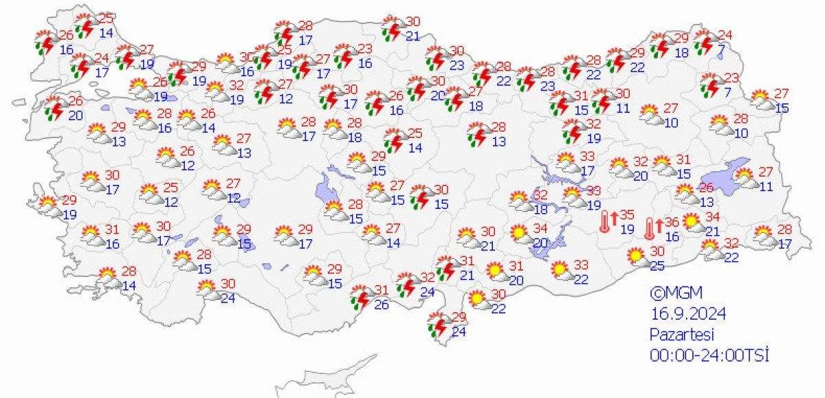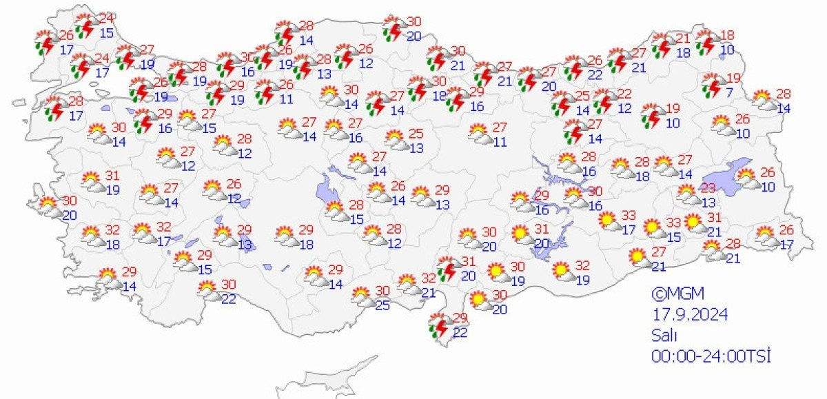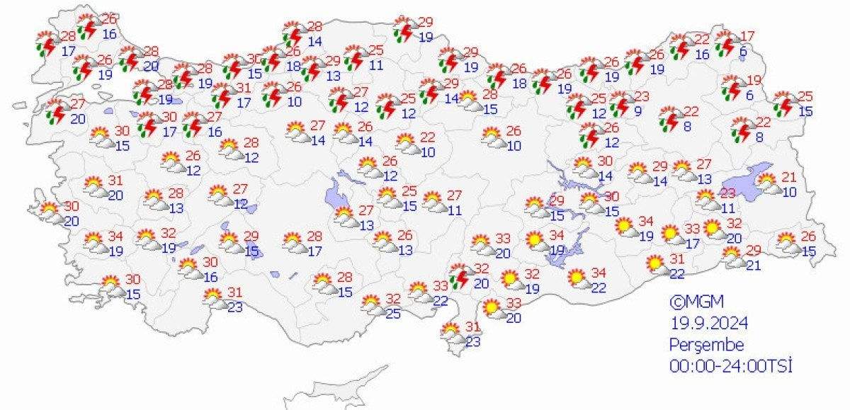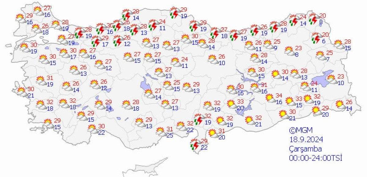 Son değerlendirmelere göre, ülkemizin kuzeybatısında, özellikle Marmara Bölgesi (Çanakkale hariç), Kıyı Ege, Batı Karadeniz (Sinop hariç), Kars ve Hakkari çevrelerinde yerel sağanak yağışlar ve gök gürültülü fırtınaların etkili olacağı düşünülüyor.