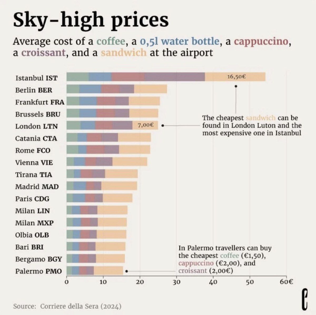 Buna göre Corriera della Sera, dünyanın birçok ülkesini içeren çalışmasında havalimanlarında satın alınan bir kahve, pet şişe su, cappuccino, kruvasan ve sandviç fiyatlarını listeledi.