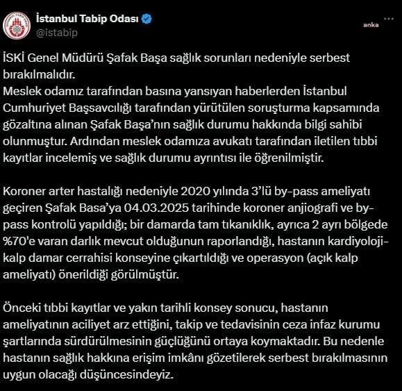 “İSKİ Genel Müdürü Şafak Başa sağlık sorunları nedeniyle serbest bırakılmalıdır. Meslek odamız tarafından basına yansıyan haberlerden İstanbul Cumhuriyet Başsavcılığı tarafından yürütülen soruşturma kapsamında gözaltına alınan Şafak Başa’nın sağlık durumu hakkında bilgi sahibi olunmuştur. Ardından meslek odamıza avukatı tarafından iletilen tıbbi kayıtlar incelemiş ve sağlık durumu ayrıntısı ile öğrenilmiştir. Koroner arter hastalığı nedeniyle 2020 yılında 3’lü by-pass ameliyatı geçiren Şafak Basa’ya 04.03.2025 tarihinde koroner anjiografi ve by-pass kontrolü yapıldığı; bir damarda tam tıkanıklık, ayrıca 2 ayrı bölgede %70’e varan darlık mevcut olduğunun raporlandığı, hastanın kardiyoloji-kalp damar cerrahisi konseyine çıkartıldığı ve operasyon (açık kalp ameliyatı) önerildiği görülmüştür. Önceki tıbbi kayıtlar ve yakın tarihli konsey sonucu, hastanın ameliyatının aciliyet arz ettiğini, takip ve tedavisinin ceza infaz kurumu şartlarında sürdürülmesinin güçlüğünü ortaya koymaktadır. Bu nedenle hastanın sağlık hakkına erişim imkânı gözetilerek serbest bırakılmasının uygun olacağı düşüncesindeyiz.”