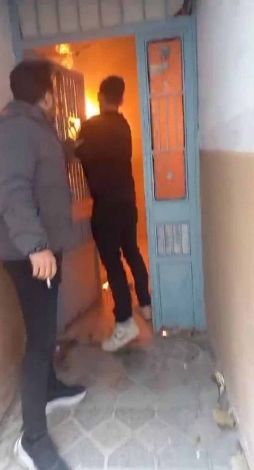 Yangının ardından binada yaşayan vatandaşlar dışarıya kaçarken bir vatandaş ise eline aldığı bez parçası ile alevleri söndürmeye çalıştı.