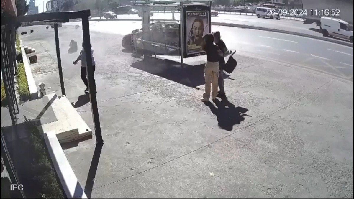 Ardından otomobilin otobüs durağına daldığı, durakta bekleyen vatandaşların korkuya kapılarak kaçtığı, kaçarken 2 vatandaşın yere düştüğü görülüyor. Korku dolu anlar güvenlik kamerasına saniye saniye yansıdı.