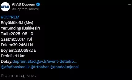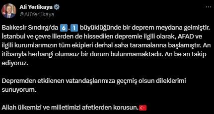Yerlikaya’nın açıklaması şu şekilde: “Balıkesir Sındırgı’da 6,1 büyüklüğünde bir deprem meydana gelmiştir. İstanbul ve çevre illerden de hissedilen depremle ilgili olarak, AFAD ve ilgili kurumlarımızın tüm ekipleri derhal saha taramalarına başlamıştır. An itibarıyla herhangi olumsuz bir durum bulunmamaktadır. An be an takip ediyoruz. Depremden etkilenen vatandaşlarımıza geçmiş olsun dileklerimi sunuyorum. Allah ülkemizi ve milletimizi afetlerden korusun.”