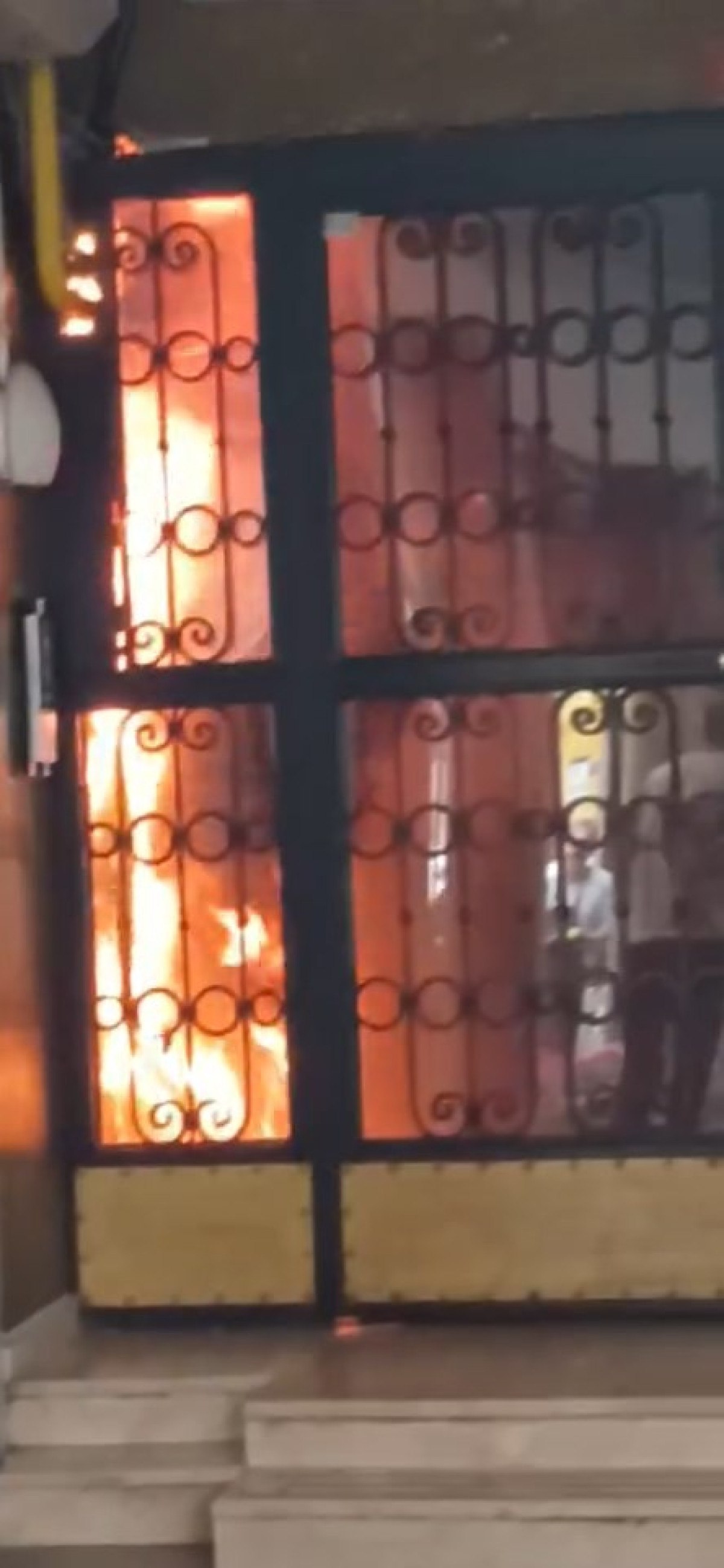 Çevredekiler, bina girişindeki alevlere kapı camını kırdıktan sonra yangın tüpleriyle müdahale etti.