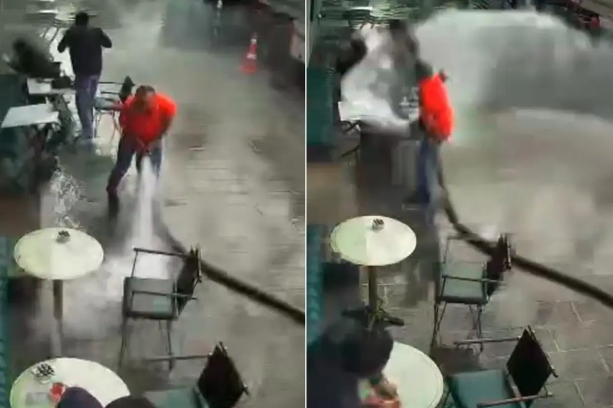 İstanbul Bayrampaşa’da bir kafe işletmecisi, iş yerinin önünü tazyikli suyla temizlemek isterken hortumun kontrolünü kaybetti. Şov yapmaya çalışırken müşterileri ıslatan esnafın yaşadığı talihsiz anlar güvenlik kamerasına yansıdı.