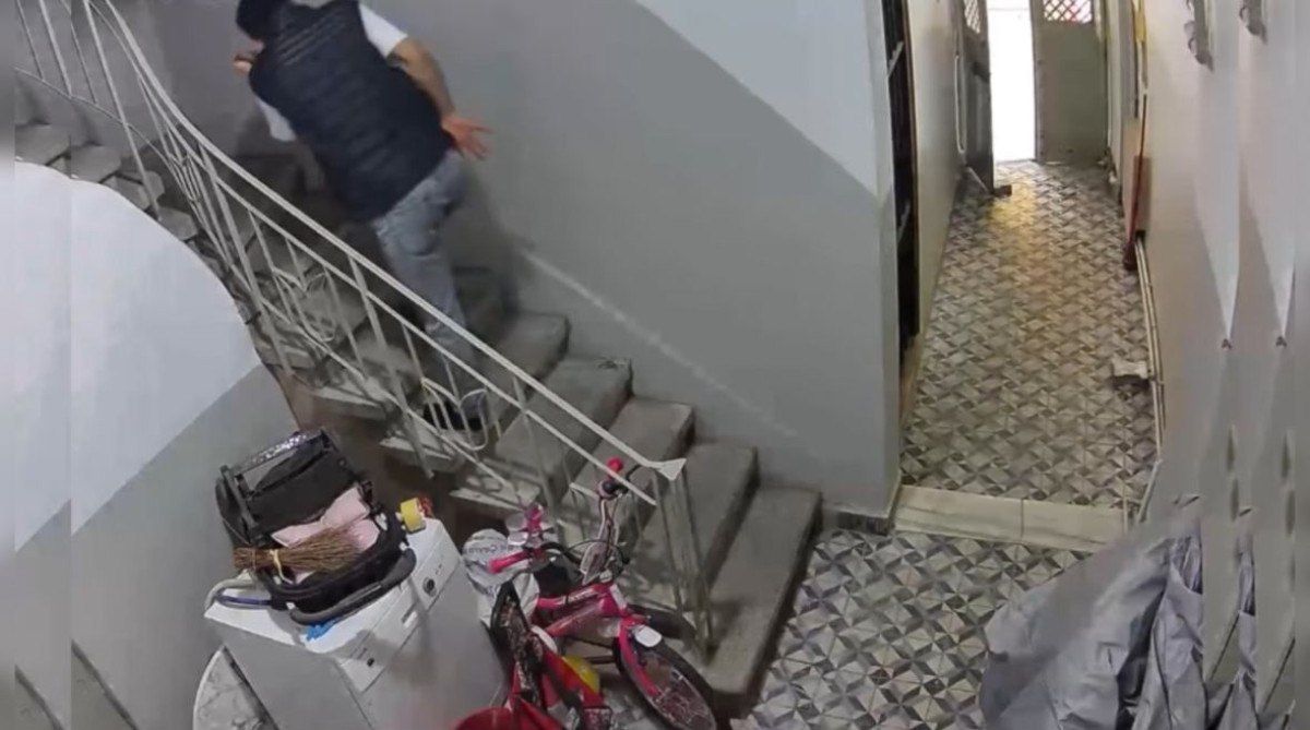 Bir süre üst katlarda dolaşan şüpheli merdivenlerden inerken montla yüzünü gizledi.