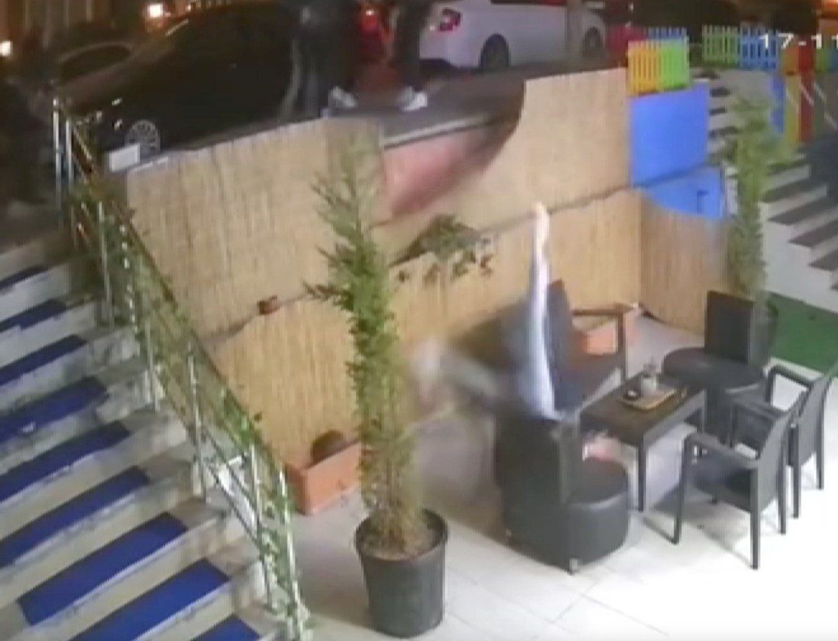 Görüntülerde, işletme önüne gelen kalabalık bir grubun birbirine saldırdığı esnada aşağıya itilerek 4 metrelik yere düşen gencin tekrar kalkarak kavgaya karıştığı anlar yer aldı.