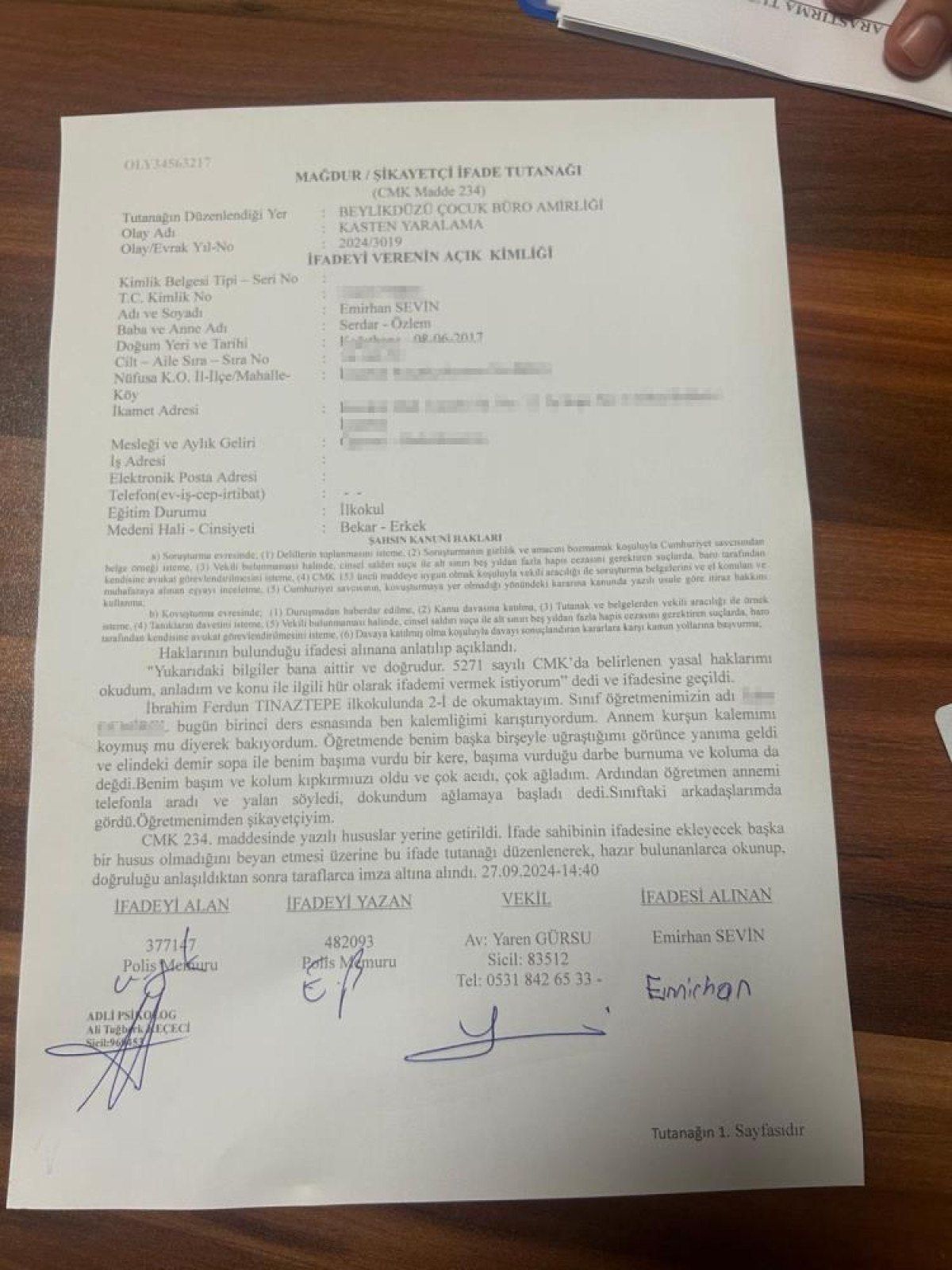 Anne Özlem Sevin, gelen telefon üzerine okula gittiğini belirterek, “Öğretmen bana dedi ki ‘Emirhan ağlıyor, okula gelmenizi istiyorum, Emirhan’ın koluna çubukla değdim’. Okulun merdivenlerini çıkarken öğretmeni gördüm, aşağıya iniyordu. Elinde demir çubuk vardı. Emirhan’ı sordum, ‘idari kısımda’ dedi. İdari odada öğretmenler Emirhan’ı sakinleştirmeye çalışıyorlardı. Oğluma yaklaştım, kolunu gösterdi. ‘Başka yerin acıyor mu’ dedim’, ‘Anne kafam acıyor’ dedi. Kafasındaki saçlar kapatmış alnındaki yarayı. Saçını kaldırdığımda şişlik ve ödem vardı” dedi.