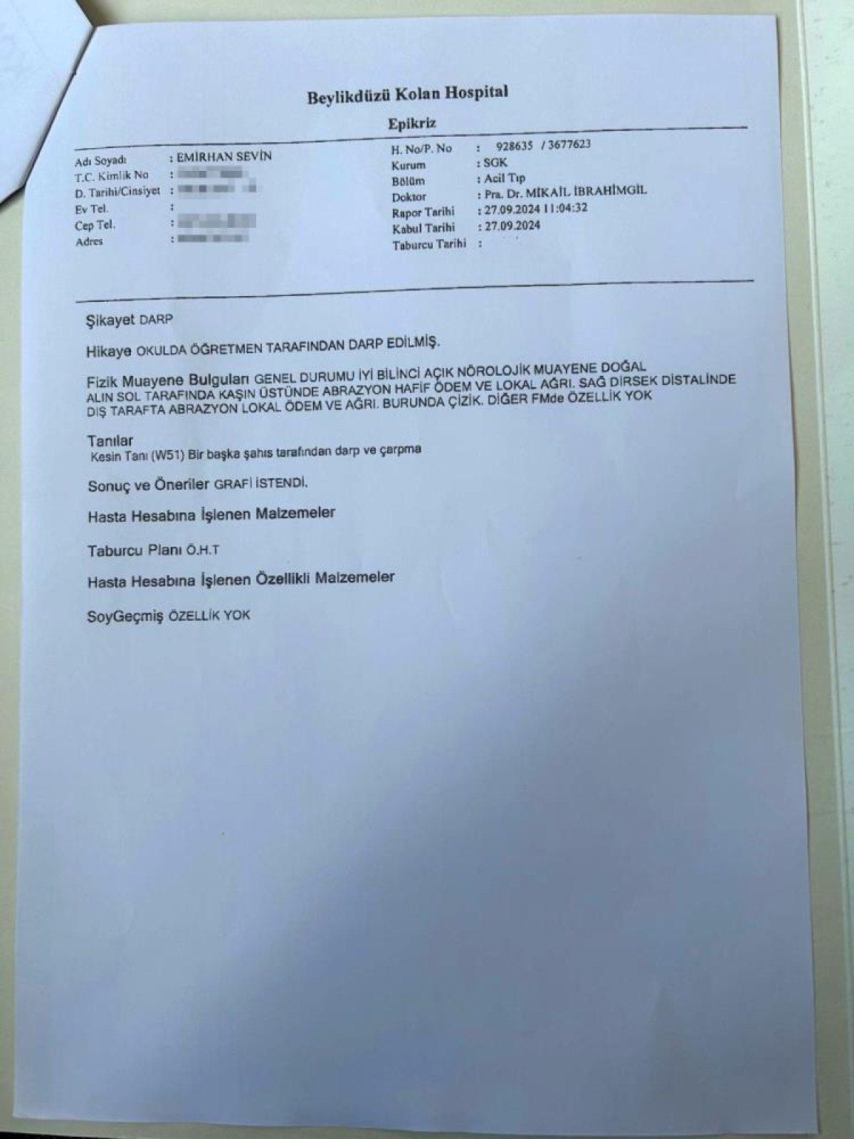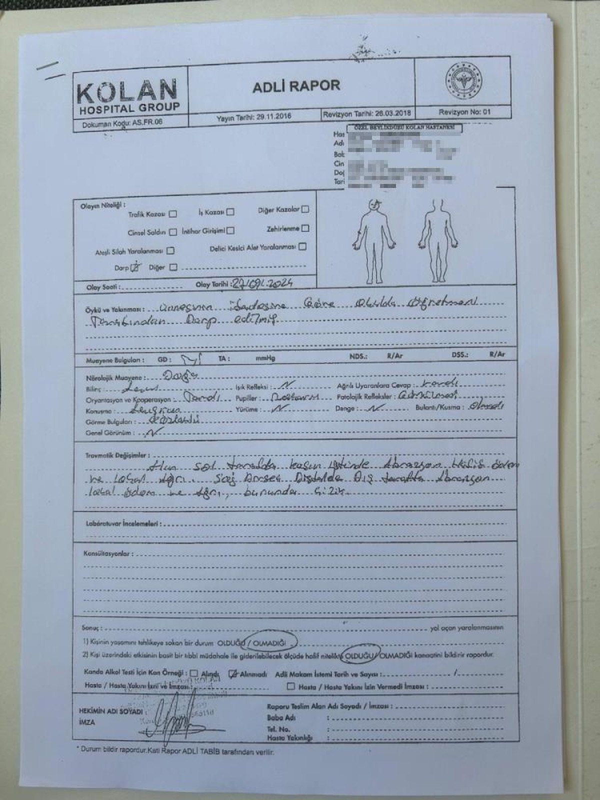 Sevin, çocuğunu okuldan alıp hastaneye götürerek darp raporu aldı ve karakola giderek şikayetçi oldu.