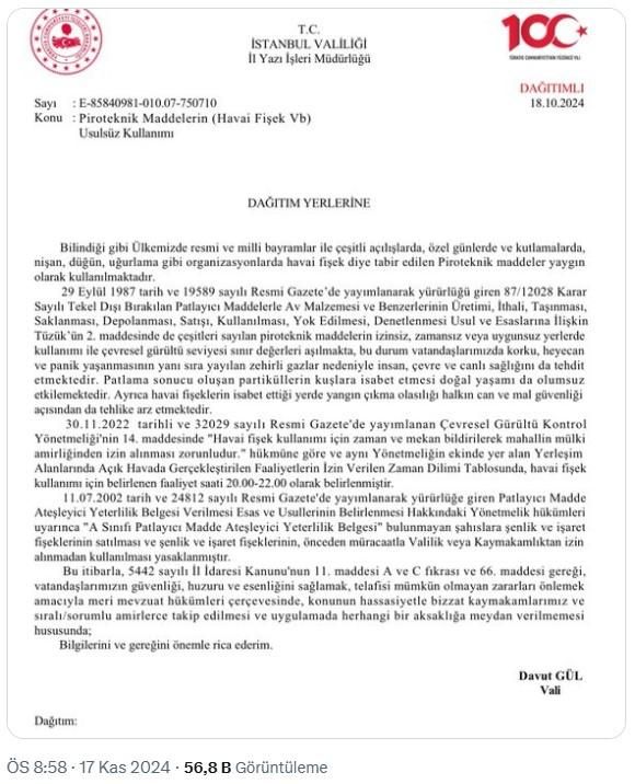 Vali Gül, sosyal medya hesabından yaptığı paylaşımda, havai fişek atmak için izin almak gerektiğini belirterek, “Havai fişek atma belgesi olan kişilere, uygun alanlar için izin veriliyor. Sadece, 20.00-22.00 saatleri arasında havai fişek atılmasına izin verilebiliyor. Kurallara uymayanlara 232 bin 264 lira cezai işlem uygulanmaktadır.” ifadelerine yer verdi. Gül, paylaşımında, konuyla ilgili genelgeye de yer verdi.