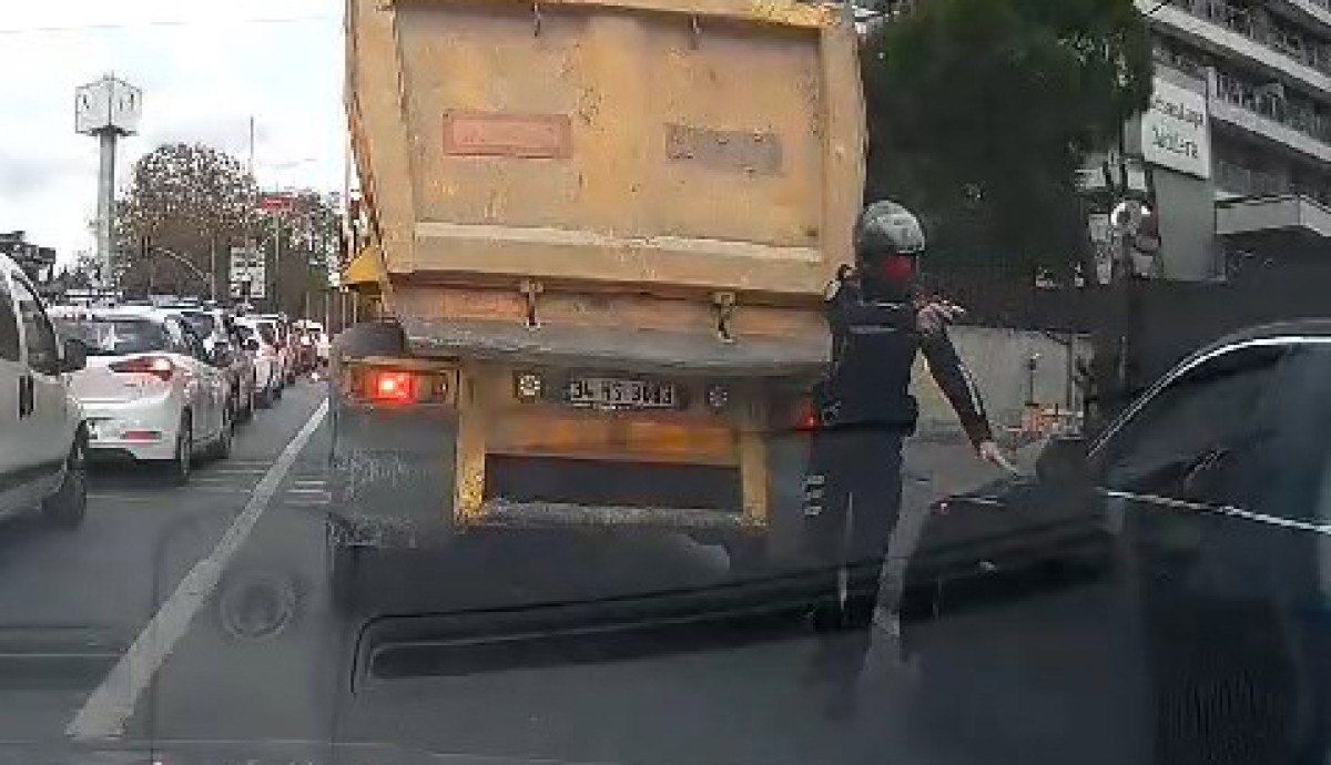 Caddede kırmızı ışığın yanması nedeniyle araçlar durunca sürücü, trafik ışıklarında bekleyen kamyonun arkasında durmak zorunda kaldı.