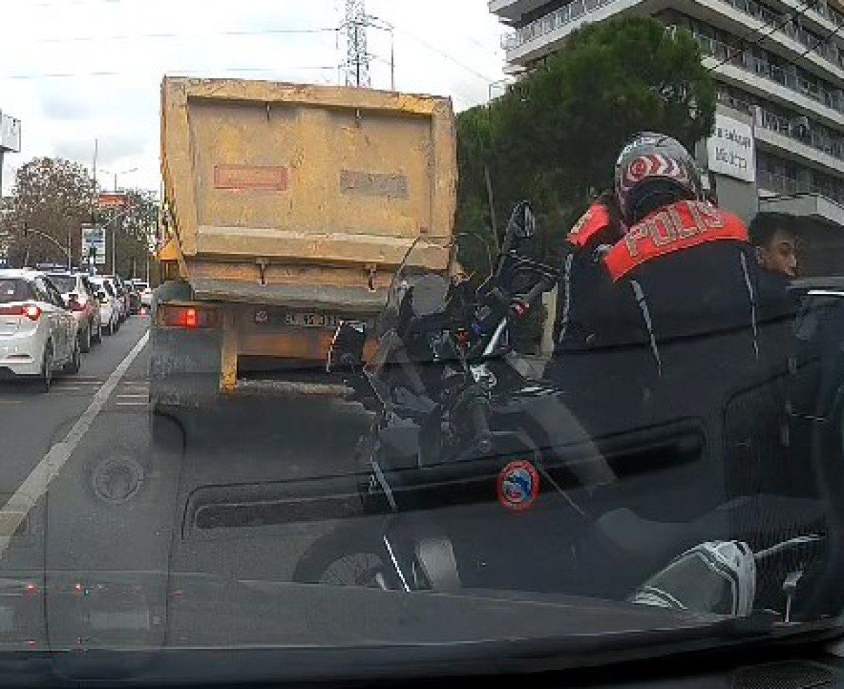 Caddede kırmızı ışığın yanması nedeniyle araçlar durunca sürücü, trafik ışıklarında bekleyen kamyonun arkasında durmak zorunda kaldı.