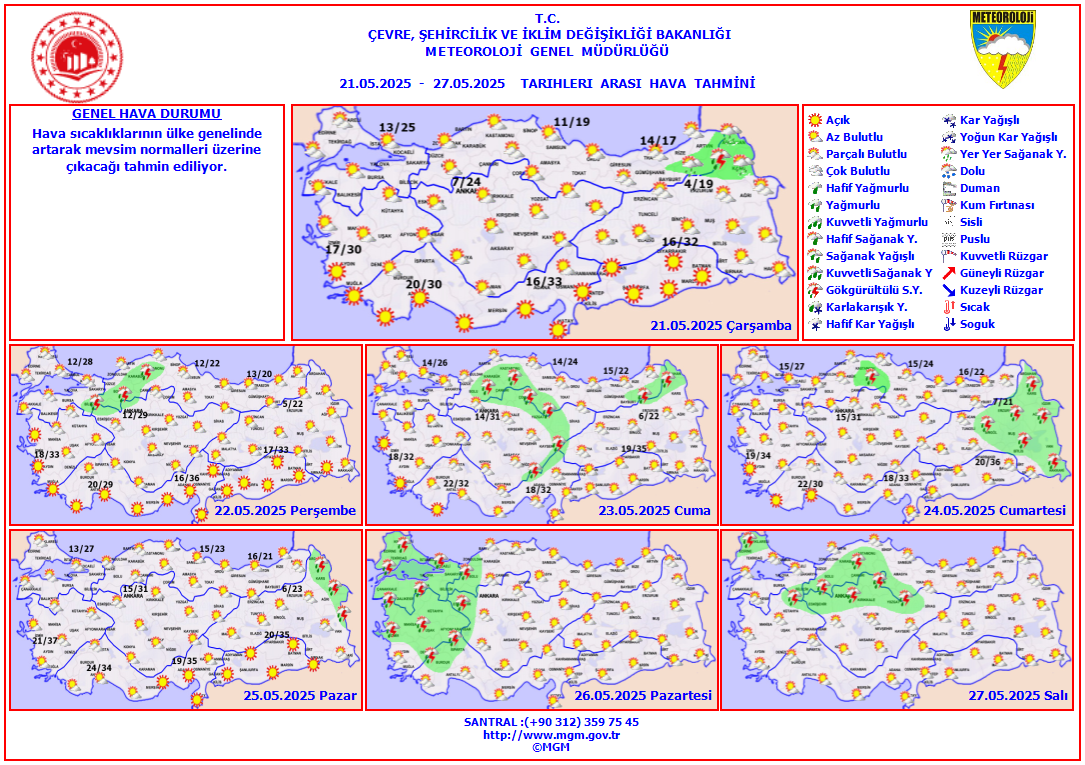 MGM’nin verilerine benzer bir bilgilendirme de AKOM’dan geldi. AKOM verilerinde de sıcak ve açık havaların pazar gününe kadar devam edeceği, pazartesi günü ise gök gürültülü sağanak yağışın beklendiği kaydedildi.