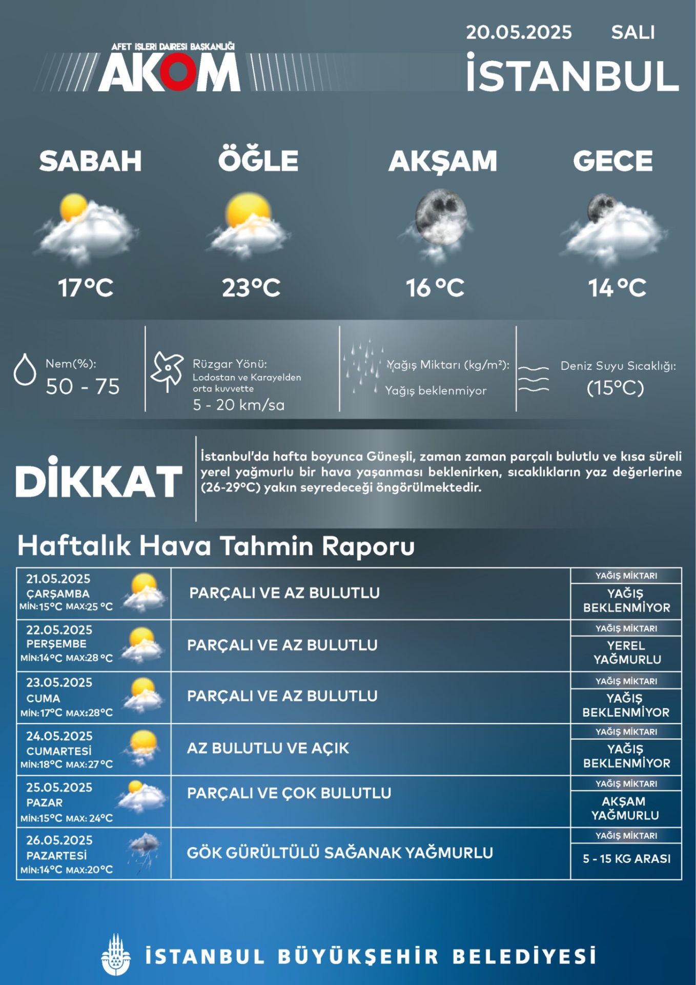 Meteoroloji Genel Müdürlüğünün resmi internet sitesinde yer alan orta ve uzun vadeli hava tahmin raporuna göre İstanbul’da sıcak havalara önümüzdeki haftanın başında sağanak molası geliyor. Bu haftanın geri kalan günlerinde havaların sıcak ve açık geçmesi ön görülüyor. Sıcaklar Pazar gününe kadar yavaş olsa da kademeli bir şekilde artacak ancak Pazartesi günü sıcak havaların yerini sağanak yağış alacak. Yağmurlu havanın İstanbul başta olmak üzere Marmara ve Ege’de etkili olması öngörülüyor.