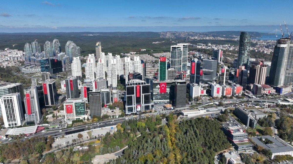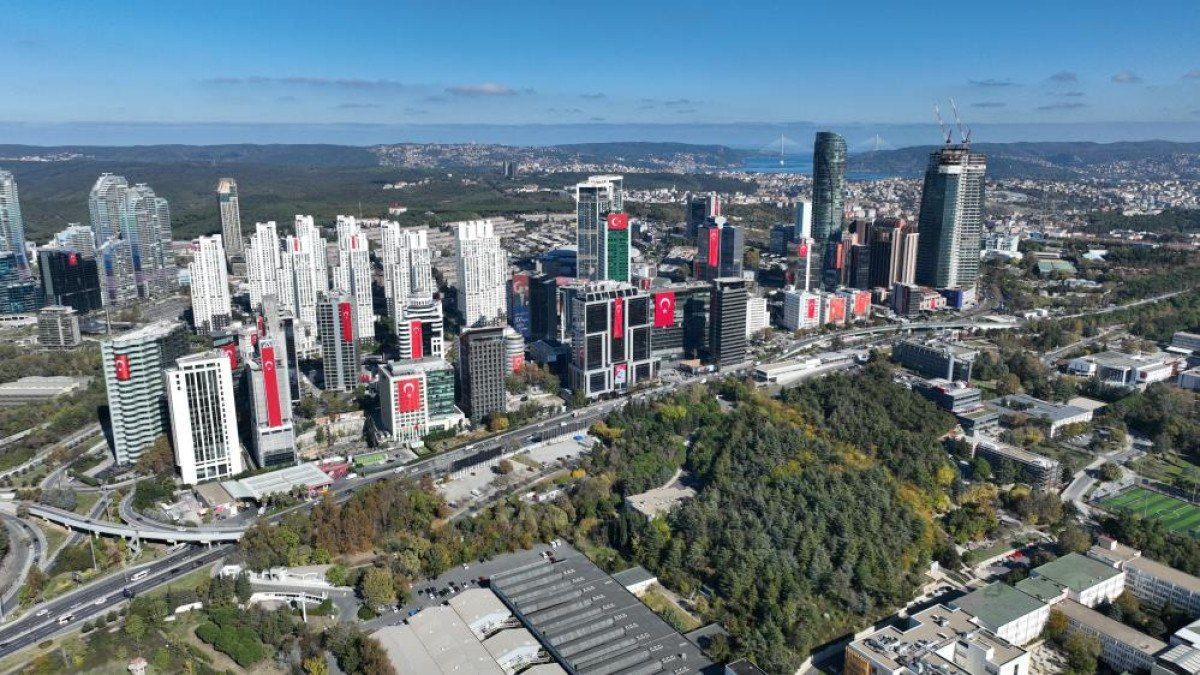 Maslak’ta iş merkezlerinin bulunduğu gökdelenlere asılan Türk bayrakları havadan görüntülendi.