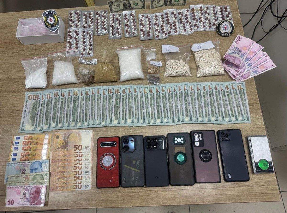 Evde yapılan aramada ise; 318 gram metamfetamin, 80 gram kokain, 95 gram eroin katkı maddesi, 8 gram eroin, 3 gram çikolatalı esrar, 192 adet lyrica hap, bin 498 adet captagon hap, uyuşturucu ticaretinden elde edildiği belirlenen 3 bin 502 dolar, 750 euro ve bin 150 TL, 1 hassas terazi, 67 adet boş şeffaf poşet ve 6 cep telefonu ele geçirildi.