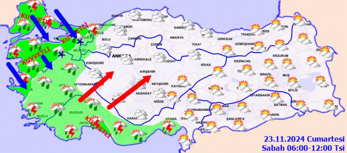 Parçalı ve çok bulutlu, bölge genelinin sağanak ve gök gürültülü sağanak yağışlı, zamanla doğusunun yükseklerinin karlakarışık yağmur ve kar yağışlı geçeceği tahmin ediliyor. Yağışların kuvvetli olması bekleniyor. Rüzgarın kuzeyli yönlerde kuvvetli, yer yer fırtına (50-80km/saat) olarak eseceği tahmin ediliyor.