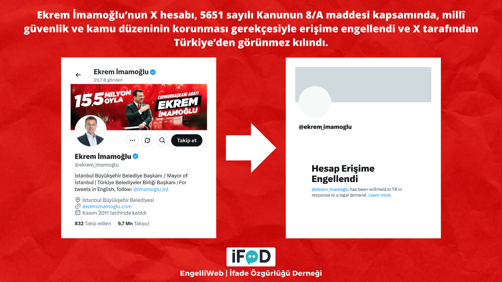 İmamoğlu’nun X hesabına getirilen erişim engelinin gerekçesi henüz resmi makamlar tarafından açıklanmadı. Ancak sosyal medyada ‘Engelli Web / İfade Özgürlüğü Derneği’ tarafından ifade edilen bilgilere göre, İmamoğlu’nun X hesabı, “5651 sayılı Kanunun 8/A maddesi” kapsamında “millî güvenlik ve kamu düzeninin korunması” gerekçesi ile erişime engellendi.