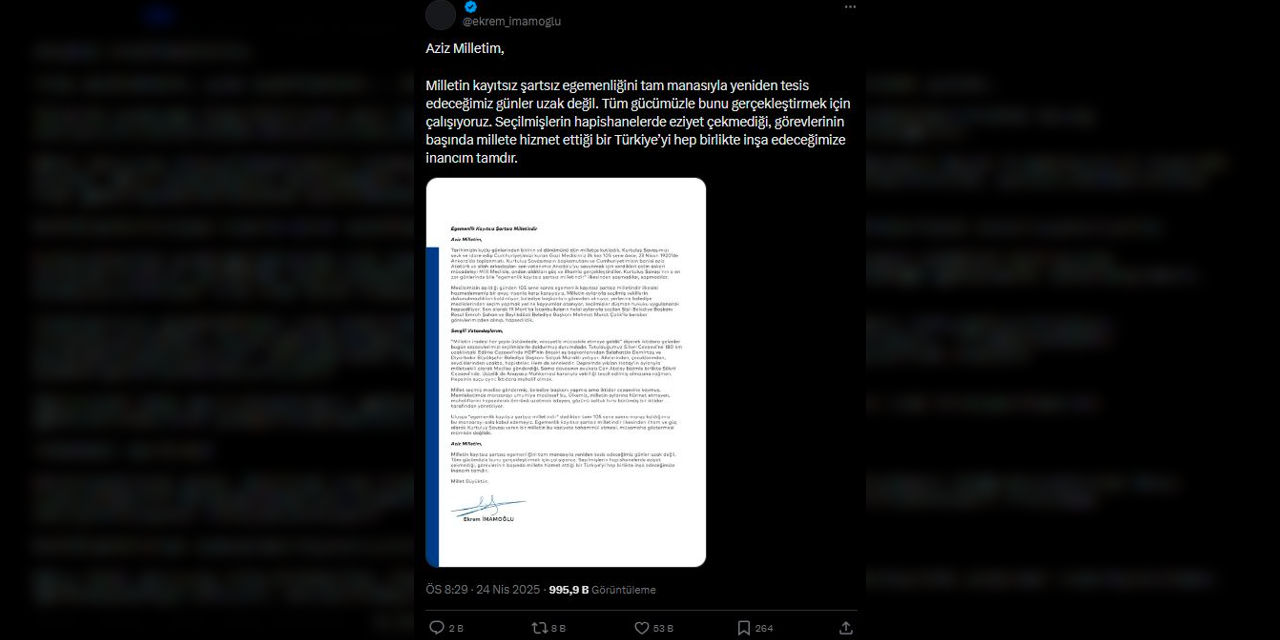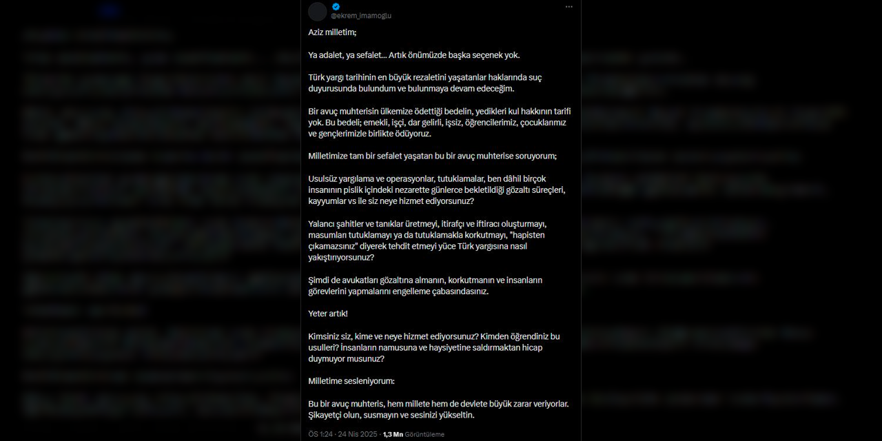 İstanbul Cumhuriyet Başsavcılığınca resen başlatılan soruşturma ile hesabına erişim engeli getirilen İmamoğlu’nun 24 Nisan’daki paylaşımları şu şekilde: