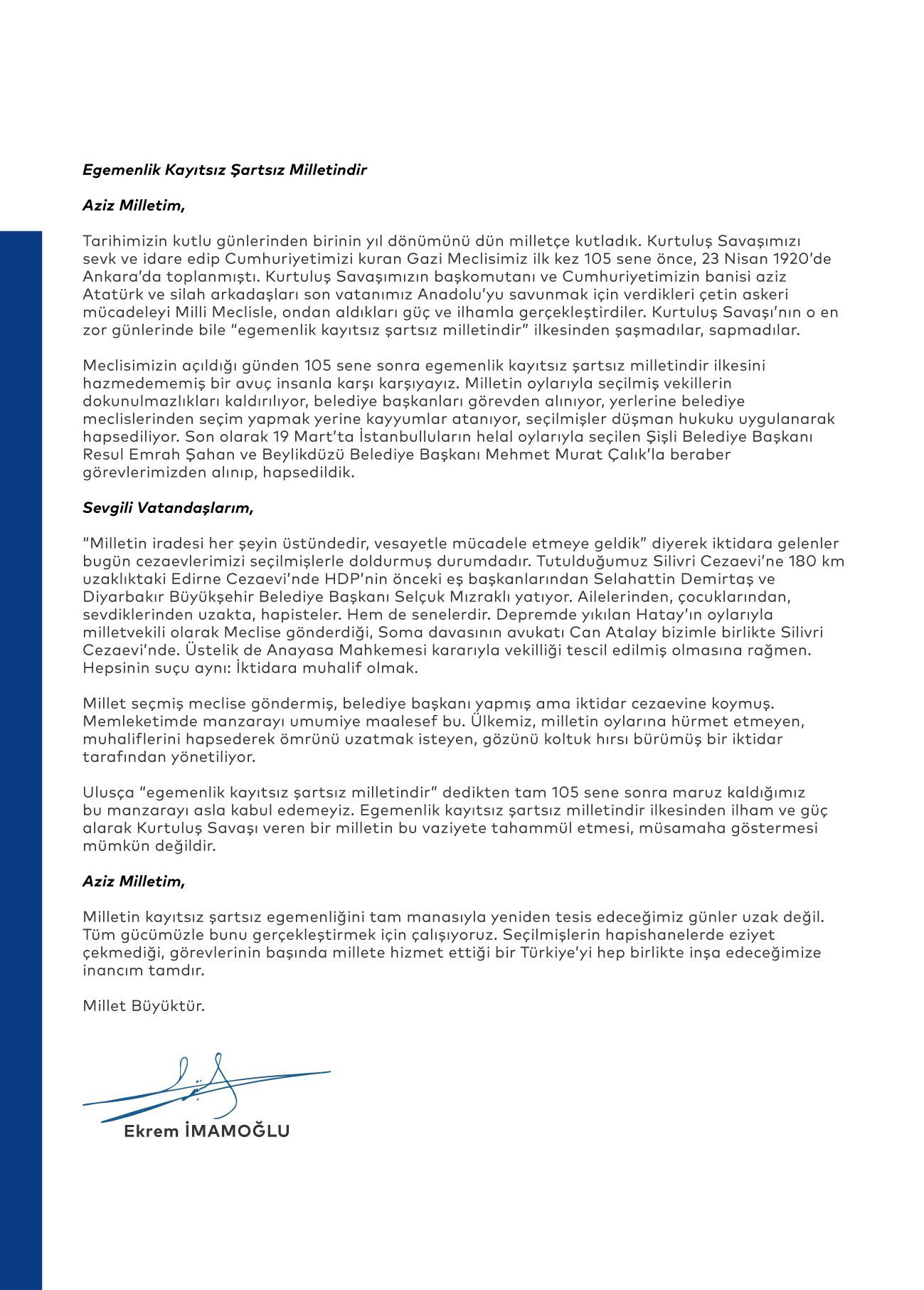 Ulusça “egemenlik kayıtsız şartsız milletindir” dedikten tam 105 sene sonra maruz kaldığımız bu manzarayı asla kabul edemeyiz. Egemenlik kayıtsız şartsız milletindir ilkesinden ilham ve güç alarak Kurtuluş Savaşı veren bir milletin bu vaziyete tahammül etmesi, müsamaha göstermesi mümkün değildir.