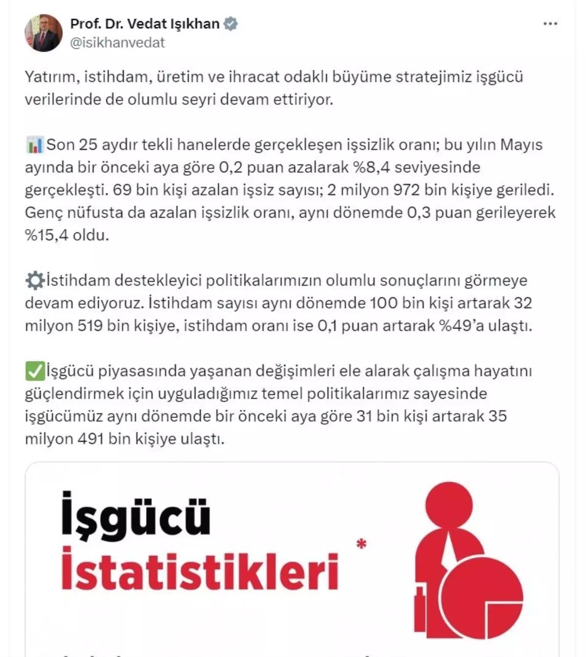 ÇALIŞMA ve Sosyal Güvenlik Bakanı Vedat Işıkhan, “İstihdam destekleyici politikalarımızın olumlu sonuçlarını görmeye devam ediyoruz. Mayısta istihdam sayısı 100 bin kişi artarak 32 milyon 519 bin kişiye, istihdam oranı ise 0,1 puan artarak yüzde 49’a ulaştı” dedi.