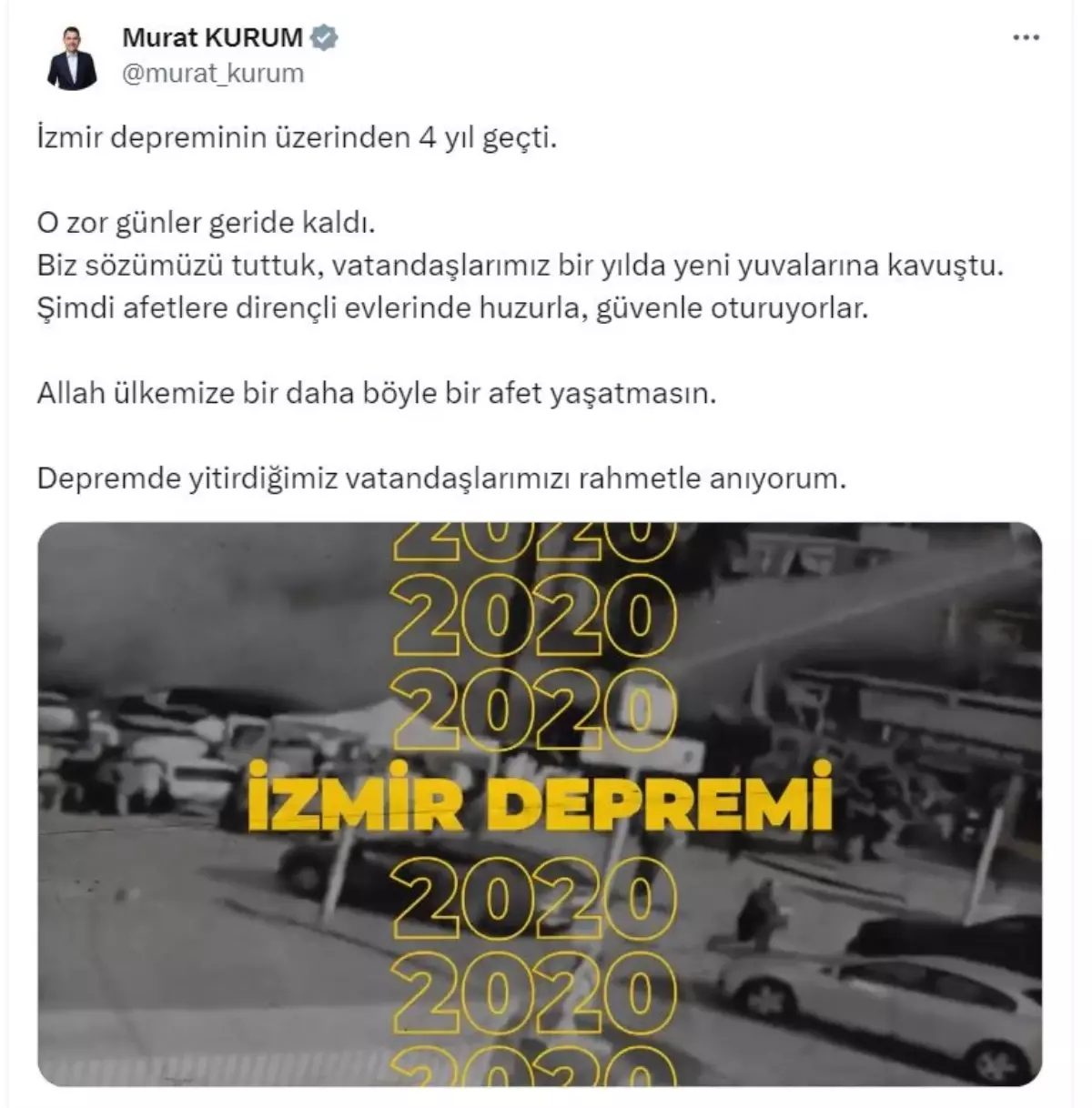 ÇEVRE, Şehircilik ve İklim Değişikliği Bakanı Murat Kurum, 30 Ekim 2020'de İzmir'de meydana gelen depremin üzerinden 4 yıl geçtiğini hatırlatarak, "O zor günler geride kaldı. Biz sözümüzü tuttuk, vatandaşlarımız 1 yılda yeni yuvalarına kavuştu ...