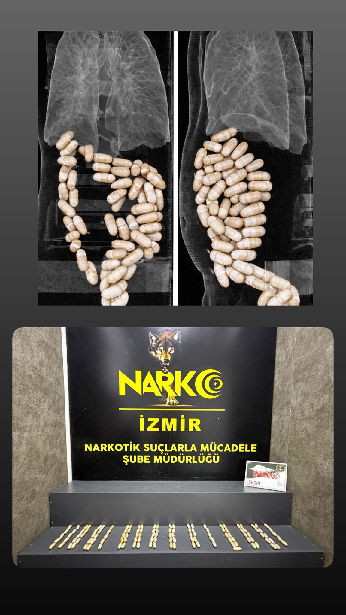 Yapılan teknik ve fiziki takip sonucunda kimlikleri tespit edilen şüpheliler,İzmir Adnan Menderes Havalimanı’nda yakalanarak gözaltına alındı. Şahıslar üzerinde yapılan iç beden muayenesinde, 127 kapsül halinde yutulmuş toplam 1 kilo 304 gram eroin ele geçirildi.