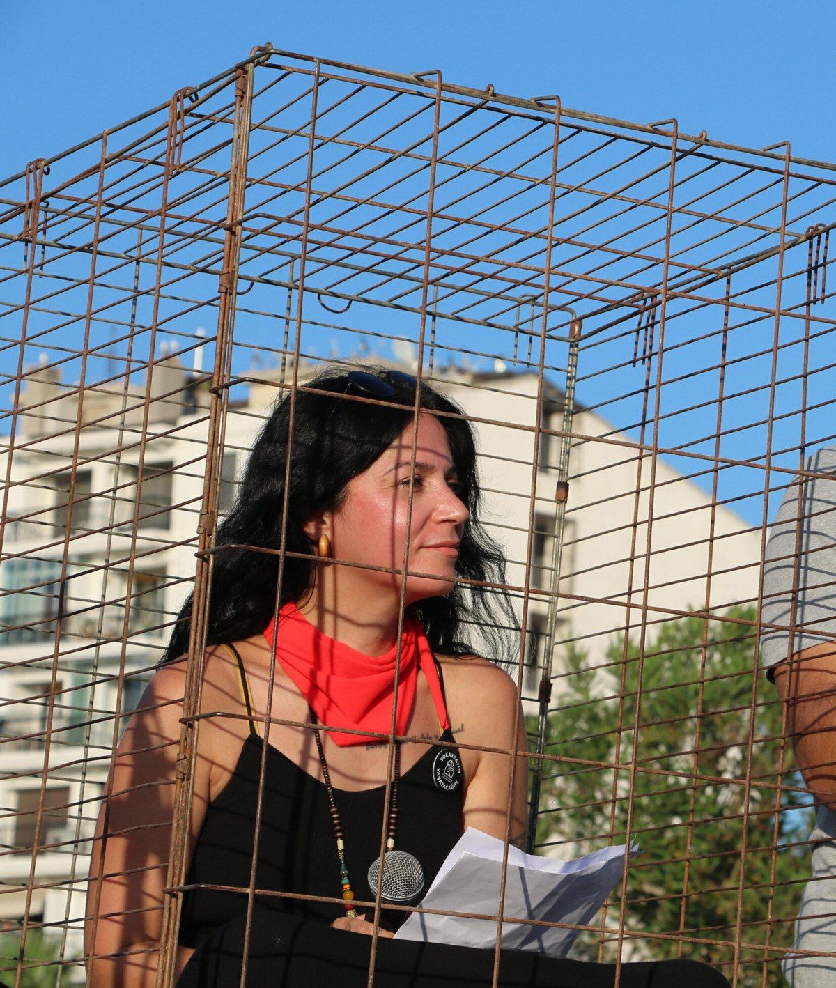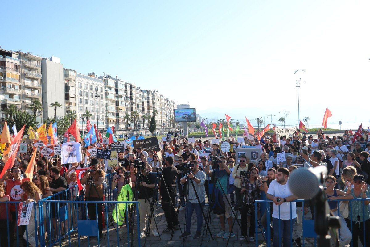 İzmir Yaşam Hakkı Savunucuları Derneği Üyesi Pınar Alpasil, Mitingde yasaya dikkat çekmek için basın açıklamasını girdiği demir kafesin içinde okudu.