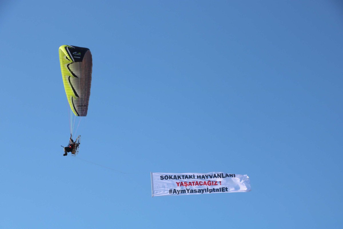 Bir hayvan hakları savunucusu ise paramotorla gökyüzünde ‘Sokaktaki hayvanları yaşatacağız’ pankartı açtı.