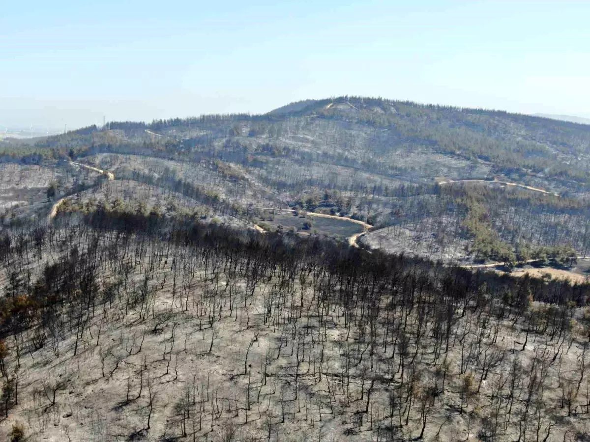 Dün öğle saatlerinde başlayan ve geniş bir alanı etkileyen orman yangınının verdiği hasar havadan da görüntülenirken ekiplerin hasar tespit çalışmaları sürüyor. – İZMİR
