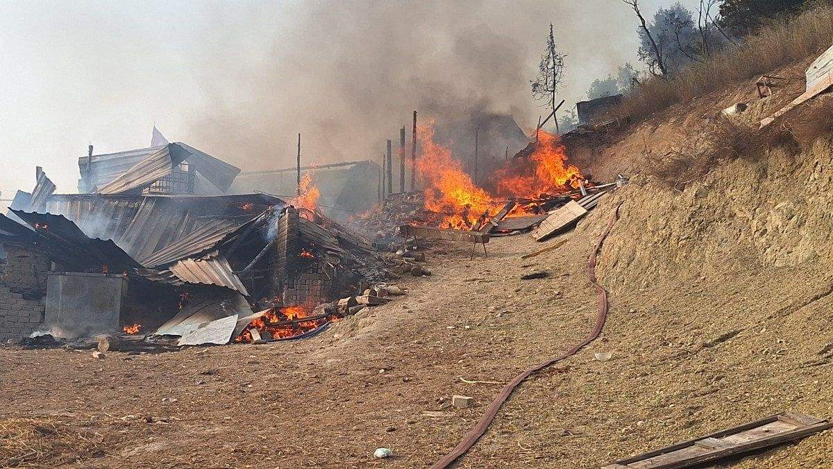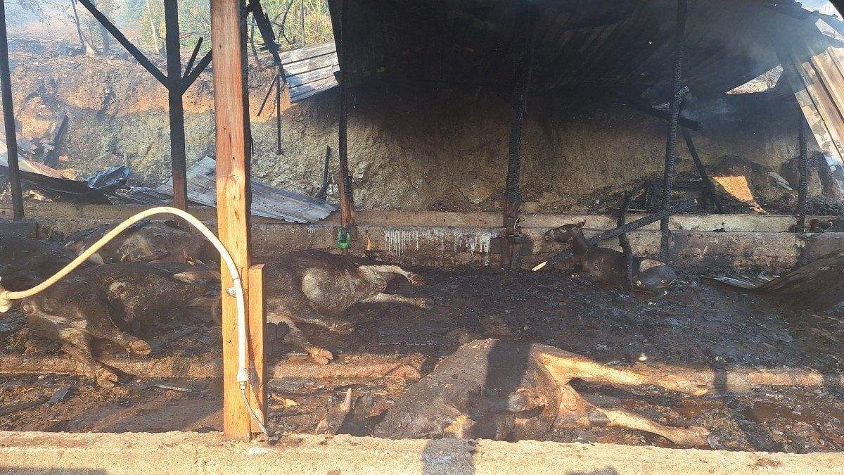 Köy evinin ahırında çıkan yangında 12 inek ve 1 eşek ölürken, yangına müdahale eden ev sahibi A.İ. ise kollarından yaralandı.