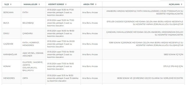 İzmir’de su kesinti yaşanacak ilçe ve mahalleler kesinti süresi ile nedenlerine göre şu şekildedir: