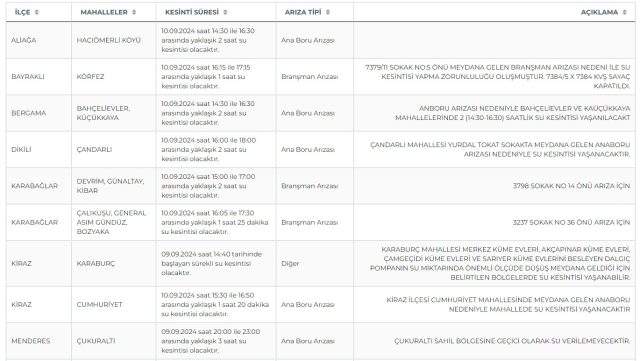 İzmir’de su kesinti yaşanacak ilçe ve mahalleler kesinti süresi ile nedenlerine göre şu şekildedir: