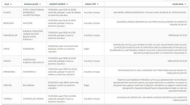 İzmir’de su kesinti yaşanacak ilçe ve mahalleler kesinti süresi ile nedenlerine göre şu şekildedir: