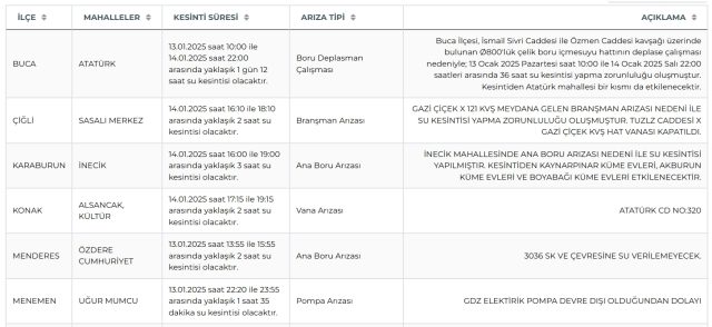 İzmir’de su kesinti yaşanacak ilçe ve mahalleler kesinti süresi ile nedenlerine göre şu şekildedir: