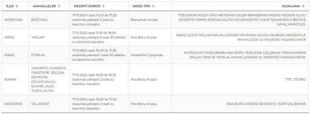 İzmir’de su kesinti yaşanacak ilçe ve mahalleler kesinti süresi ile nedenlerine göre şu şekildedir: