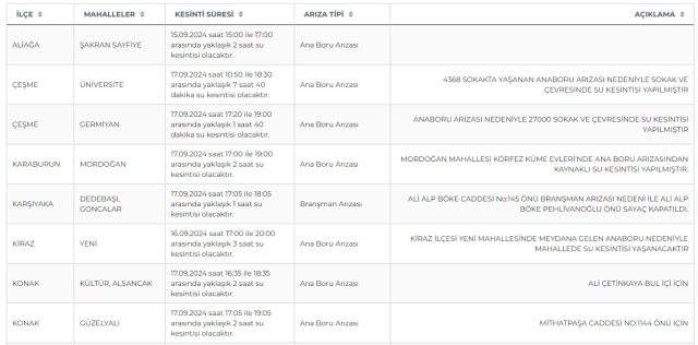 İzmir’de su kesinti yaşanacak ilçe ve mahalleler kesinti süresi ile nedenlerine göre şu şekildedir: